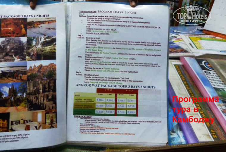 На пляже Кай Бей о. Ко Чанг в разных турбюро тур 3 дн/2 н (на тур 2дн/1н нет смысла ехать – ничего не увидите) с проживанием в отеле 4* предлагают за 9,2 тыс. бат/чел, + услуги русскоговорящего гида - 1000 бат/чел. К тому же надо платить за re-entry permit тайскую визу 1200 бат/чел. Отельный гид Максим Coral travel предложил ту же поездку за 12,7 тыс бат + re-entry permit.