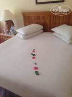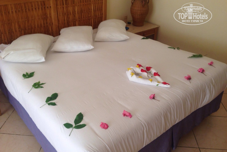 По приезду в отель нам сказали что нужно присесть и подождать. На вопрос чего ждать и сколько был получен ответ от девушки guess relation: "А куда вам уже спешить?!". Хорошо. Дождались мы наконец обзорного похода по территории, услышали где что и как. Далее нам сказали что номер с видом на сад, который нам дали в тур форме, всего один, и когда он будет готов никто не знает, мол ждите, спешить же некуда. Благо дело наше обаяние и шоколад решили этот вопрос и нас поселили в номер с видом на бассейн. Номер не плохой, не смотря на то, что старый. Единственный минус это душ, который не фиксировался, но это можно было пережить.