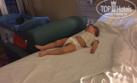 Заказывали детскую кровать, это прямоугольный манеж с лазом на молнии. Матрас довольно комфортный, плед взрослый вафельный выдали, типа халата, можно укрывать вполне. Но мы на СС, просто придвинули спинку кресла к нашей кровати, создав борт и так спали. Кровать для взрослых высоченная, как трон, даже для взрослых, ребёнку забраться/спуститься с ростом 74 шансов нет.