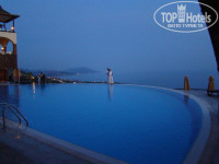 Территория Utopia просто великолепная: мыс, выдающийся в море, на котором стоит отель, позволяет любоваться Средиземным морем с 3-х сторон здания, а 1йодной стороны красивейший вид на горы. Вилла, в которую нас поселили (доплатив, правда, 30$) полностью утопала в цветах и как будто висела над морем, мы ни капельки не пожалели, что заселились не в основное здание отеля. В номере виллы - очень чисто и красиво (есть постоянно обновляющийся мини-бар, чайник, телевизор, сплит, сейф, фен, моющие средства и полотенца). Единственное о чем нужно позаботится - об утюге.