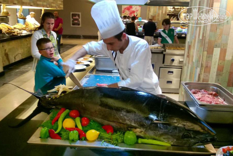 Выбор блюд здесь огромный, особенно морепродуктов. Например, подавали гигантского тунца, мидии, королевские креветки. Но при этом те же креветки были сухие, многие блюда недосоленные. Хотя кому то это нравится. Предусмотрено питание для малюток. Было очень много десертов из фруктов, а еще мне понравились цветные макароны, которые они обжаривали с разными морепродуктами. Неплохие были котлеты, рыба на гриле, курица, кебаб. Но если честно больше всего нам понравился бар. Это первый турецкий отель в котором подают например виски «Чивас Рыгал». Пили мы его так много, оттого и Рыгал) кроме того были «Джеймсон», водка «Финляндия», текила «Ольмега» и поэтому мы пили-пили. Благо утром благодаря морю и воздуху все улетучивалось, словно ничего и не было.