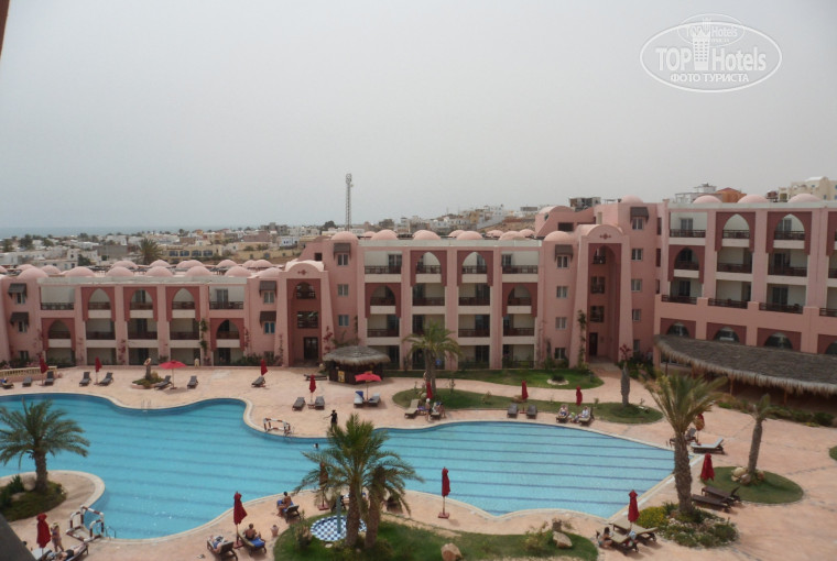 отдыхали парой в этом отеле с 18 по 28.05.16 г. на самом острове джерба смотреть не чего экскурсий мало и он только для пляжного отдыха. гиды говорят что от отеля все далеко и рынки и магазины и предлагают экскурсию на джербу. но ближе всего находится к отелю город зарзис до него можно своим ходом доехать на такси по счетчику в одну сторону за 5 динар или без счетчика за 6 динар просто выйти на дорогу у отеля и поймать такси.до зарзиса 20 мин на такси там супермаркеты, рынки и магазины лучше чем на джербе куда возят гиды. ехать до отеля из аэропорта около часа, заселили сразу так как отель большой и пустой. номера плохо убирают и убирают только если просить, кондиционеры не работают. народу в отеле отдыхает мало, но в баре стаканов всегда не хватает, алкоголуные и безалкогольные напитки иногда разбавляют. еда однообразная, но найти что поесть всегда можно.анимация вялая и обнообразная. в целом отель только для пляжного отдыха только лежать и загорать:-) море было очень теплое:-)