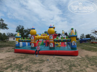 Территория у пансионата отличная. Куча детских городков, батутов, лабиринтов, качелей раскиданных по все территории. По все территории раскиданы точки Wi-Fi. Территория постоянно прихорашивается и улучшается. Есть теннисные и спортивные корты, теннисные столы. Несколько кафе и магазинчиков.