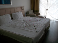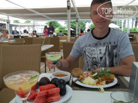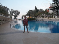 Здравствуйте, я дочка пользователя Денис Киш . И так, приехали в отель мы довольно рано в пол 7, но всю усталость отогнала волна эмоций. На ресепшене нас довольно быстро зарегистрировали и уже через несколько минут я с отцом побежала рассматривать сам отель . Конечно впервые там легко можно заблудиться, особенно для 13 летней девочки , которая ещё не очень умеет ориентироваться на местности, да и хорошо запрятанные в уголках отеля сортиры, тоже не с проста найти. Достав из чемоданов купальники и плавки, мы в первую очередь разумеется погнали рассматривать море и бассейны. Море чистое, на пляжах видно хорошо убирают, хотя иногда , если конечно постараться, то возможно найти какой-то выкинутый, ещё не убранный пакет, хотя везде стоят урны . Рыбки очень пугливые, видно туристы их хорошо распугали )). Пляжи отелей особо не ограждёны друг от друга и хоть территория не слишком велика, место где лечь и упасть всегда найдётся . Перейдём же к бассейну. Вода хорошо обработана и запах хлорки даже почти не чувствуется, мне рассказывали, что эту воду обрабатывают не только ей, но ещё и облучают, кратко говоря купались мы в полной безопасности . Возле бассейна две горки, печально конечно, что они не работали круглосуточно ;D . Жалко вот только, что никто не следит на горках за людьми, которые с них спускаются, ведь на вывеске прикреплённой не так далеко, написано как можно спускаться, как нельзя и со скольки лет, но увы спускаются там как захотят и кто захочет, но для озорных туристов, которые были бы не прочь прокатиться с горки на животе, это даже некий плюс )) . А теперь любимая статья для гурманов . Еды там конечно гора горой , выбирай главное чтобы в животе вместилось, ведь не раз у меня была такая ситуация , что возьму тарелок 10 и уже на 3 не знаю куда деть остальное )) Мясо сочное с хрустящей коркой, сладости изысканные, рыба на столах только лучшая , был бы у меня 2 живот, не выходила бы со столовки, ведь все блюда были свежие, со своим восточным вкусом .Расскажу я вам по секрету, даже приехав домой мне даже сейчас не хочется есть . А теперь про номер который нам выдали раньше чем полагается аж на 5 часов !Номер конечно классный. Кондиционер мощный , сама спальня довольно просторная и светлая .На балконе конечно виднелся край бассейна. Хороший вай фай ловит даже на пляже ! В отеле были три кровати , шкаф, плазма, компьютерный стол без компьютера и зеркало. Ещё имелся мини бар и сейф .В ванной комнате всё как положено . Огромное зеркало, раковина, туалет и ванная, гели для душа, мыло, что-то там для волос , подобие шампуня .Самое интересное мне показалось то, что в отеле в сортирах две туалетные бумаги, это наверное чтобы не попасть в неловкое положение )) Теперь обслуживание . Все аниматоры и официанты хорошо владеют языками, правда некоторые немного угрюмы. Ведь приспичило мне однажды слегка поиграть с одним аниматором , я конечно имя его говорить не буду, человек как никак , но мягко он меня послал, отссылаясь на то , что я веду себя как ребёнок . Обидно неправда ли? На вид он мне очень понравился, даже напомнил мне моего любимого актёра Хотите сказать что я должна быть серьёзной тёткой в 13 лет? И мне уже запрещено резвиться? Разве аниматоры не должны развлекать детей? Эх, ладно пропустим сию тему и перейдём к другой, а именно к развлечениям . Дааааартс, бочааааа кхм , ладно я не бу