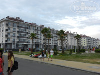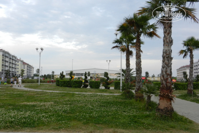 На территории отеля продают мороженное, прохладительные напитки, есть прокат велосипедов, магазинчики и аптеки. Развлечений нет никаких (только для детей площадки во дворах каждого корпуса). Всё есть за территорией, столовые и магазины в шаговой доступности в совхозе Россия. До ближайшего Магнита 10 минут в сторону Псоу, До пляжа минут 10 неспешего шага (идти лучше по нормальной дороге вдоль Екатерининского квартала, по границе с Абхазией по расстоянию меньше, но дорога никакая). Море чистое, но каменюги в воде с кулак и больше, более менее мелкая галька только на берегу, по пляжу разложены деревянные дорожки, зонтики и шезлонги по 200 рублей на день. Море не мелкое, сразу по колено, метрах в 10 глубина более 2 метров. До столовых тоже минут 10-15. Средний чек на двоих покушать 500-600 рублей (первое, второе, салат и компот). Есть небольшой парк в совхозе с аттракционами. Автобусы ходят каждые 10 минут в разные направления, уехать не проблема в разные части города Сочи.