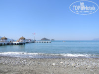 На пляже есть лежаки под навесом от солнца, их можно выдвигать куда захотите. Для пущего комфорта можно взять матрасы и подушки. Лежаки можно также вытаскивать на пирс. Так как пляж галечный, то заходить в воду с берега - сомнительное удовольствие. С пирса намного удобнее, для чего там имеется 4 лестницы. Вода в море чистая, никакого мусора я не заметила. Разве только в день, когда были сильные волны, к берегу приносило водоросли. Температура воды в мае - порядка 22 градусов. Во второй половине моего отдыха на пирс выставили две замечательных беседки, в них можно сделать отличные фото.