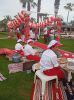 На обед также были разнообразные гарниры (особенно понравился кус-кус), два вида вкуснейших супов, холодные и горячие закуски. На дальних столах - мясо и рыба, выбора много. Справа от мяса и рыбы - столы с выпечкой, готовили местные лепешки и много всяких вкусностей. Сладости - бисквитные тортики, суфле, песочная выпечка, местные десерты.