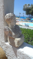 Территория благоустроена и прекрасно содержится. Как и весь отель, территория талантливо и креативно оформлена мамой хозяина, Марией. Здесь также много интересных и необычных объектов и красивых растений. Из стволов деревьев, выброшенных морем на берег, выполнены интересные инсталляции и скульптуры, старинные мельничные жернова стали арт-объектами ландшафтного дизайна, есть небольшая часовенка со звонницей и много других интересных объектов. Есть бассейн, возле него лежаки, зонтики, столики.