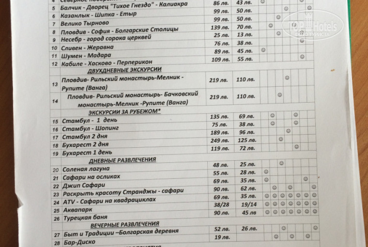 Из экскурсий. Ездили в аквапарк - на целый день стоимость 38 лев, на пол дня 28 лев. До аквапарка и обратно ездят бесплатные маршрутки и автобусы, которые забирают и высаживают на остановках общественного транспорта. Аквапарк хороший. Самостоятельно ездили в Несебр, туда на морском катере, который отходит с пирса каждые 20-30 минут, стоимость 10 лев, обратно на общественном транспорте 1,3 лев. Городок красивый, погуляли, пообедали в ресторанчике с видом на море, много магазинчиков и сувенирных лавок. У туроператора /АнексТур/ брали 2 экскурсии. Болгарское село /52 лев/чел/ - привезли в болгарскую деревню, там неплохо все стилизовано, можно сделать красивые фотографии, ужин так себе /в отеле поели бы лучше/, развлекательная программа тоже так себе /сначала были какие-то детские конкурсы, потом танцы/. Созополь-Ропотамо /68 лев/чел/ - катание на моторных лодках по реке Ропотамо, вообще ничего интересного, 10 мин в одну сторону, 10 минут обратно, никаких обещанных красот, растительности и животного мира мы не увидели, единственное что нам показали - это черепашки. В Созополе около часа гуляли с экскурсоводом, затем был обед, потом свободное время. На обратном пути завезли в торговый центр в Бургасе, для желающих потратить деньги. Мое мнение, что экскурсия своих денег не стоит.