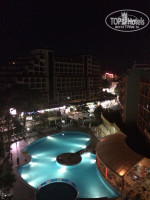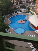 Номер. Вид на бассейн. На балконе стол, 2 стула, сушилка для вещей. Номер достаточно просторный. Холодильник ежедневно пополняли 2 бутылочками воды 0,5 л. В ванной комнате нет шампуней,гелей для душа, мыла, зубных щеток и т.д. Есть 2 дозатора с моющей пеной: около раковины и в душевой. Фен есть, но мощность слабая. Кондиционер не справлялся. Первые дни, когда не было сильной жары, в нем и потребности не возникало. Во второй половине отдыха стало более жарко, и то как он работал нас не устраивало. Несколько раз оставляли заявку на ресепшене, в предпоследний день отдыха починили. Уборкой остались довольны, полотенца меняли ежедневно. Телевизор - несколько русских каналов. WiFi ловил в номере, но не всегда. Сейфа в номере нет, можно арендовать ячейку на ресепшене, стоимость 5 лев/сутки.