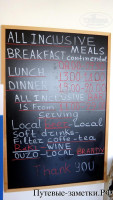 На завтрак: ветчина, сыр, вареные яйца, хлеб, джем, хлопья, молоко, чай, кофе, сливки, разбавленный апельсиновый сок.