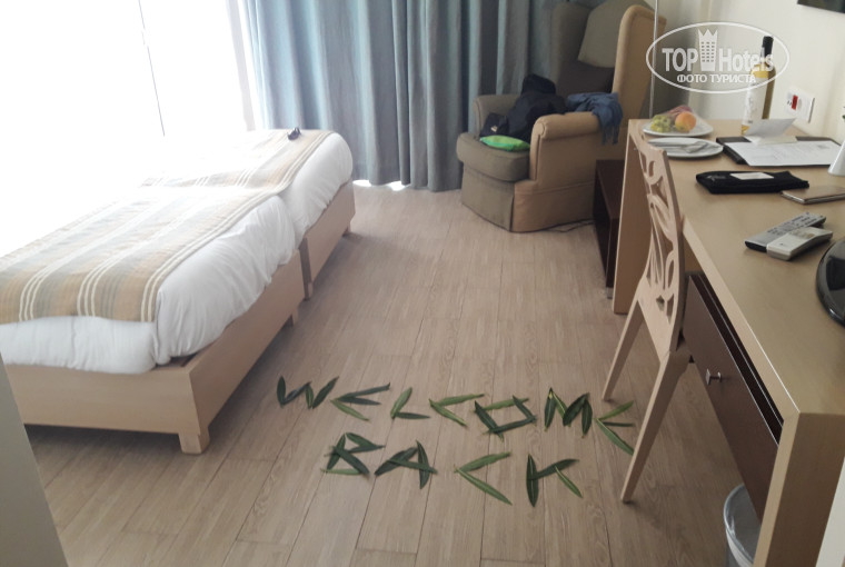В мае 2016 года мы с сестрой отдыхали в Filion Suites Resort & Spa и отель нам очень понравился, мы решили в него приехать в августе и оплатили тур, но до августа было еще далеко и мы стали присматривать где в Греции еще можно отдохнуть и после наших всех сравнений отелей мы опять остановили свой выбор на Filion Suites Resort & Spa (сравнение цена-качество). Мы были приятно удивлены когда мы вошли в наш номер, там нас ждала бутылка вкусного белого вина, фрукты и надпись см. фото)))