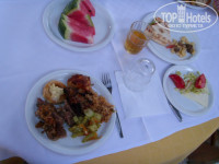 В ресторане - изобилие блюд.На завтрак пекут блины, жарят омлет, глазунью и пончики, много выпечки, йогурт, варенье, мед, арбузы.