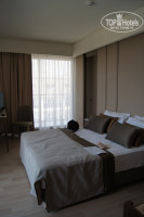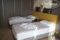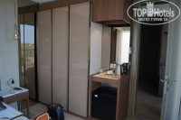 1)Размещение и номер. Заселили очень быстро. В отеле оказались в 11 часов утра, заполнили карточку, надели браслеты и проводили в номер. Номер был оплачен семейный с видом "на сушу". Нам же достался с видом на море и огромной террасой. Номер состоит из двух комнат, у каждой есть свой душ, кондиционер, мини-бар, сейф(ПЛАТНЫЙ, 2 ЕВРО в день). Мини-бар пополняется ежедневно:кола, минералка, пиво,вода - бесплатно. Мало освещения в комнатах, вечером темно. Лапмы декоративные не очень надежные - постоянно падал плафон.Благо не разбился. А так оформлен достаточно красиво, стиль эко+лофт, что нетипично для Турции и что удивляет самих турков. При нас часть доделывали, например, вешали планы эвакуации, меняли разбитые зеркала в коридорах, завозили ковры и озеленение.