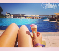 Отдыхали в 2015 году с парнем в этом отеле. Нам очень повезло, бронировали четырех звездочный отель этой же сети, но он был закрыт на ремон и нас поселили в пятерку. С виду отель симпотичный, большая территория, много этажей. При заселении предложили заплатить 20 $, чтобы заселиться сразу, так как мы приехали рано утром, а заселение по моему было с 2-х. Мы согласились и попросили за это номет с видом на море. Как таковых там нету, море видно если высовываться с балкона. Но тоже не плохо. Очень не понравился мужчина на ресепшене, когда ему было удобно он понимал по русски😀 А иногда не понимал 🤗 В общем то это нас не сильно растроило ибо больше мы с ним ни как не общались.