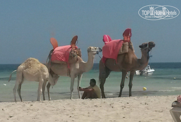 ПЛЯЖ. Вообще самое сильное впечатление от поездки – это, конечно, же море. На средиземном были много, и с разных его берегов и стран, но Джерба - впервые, потрясающе теплое, очень комфортное для детей и температурой, и заходом (кругом песочек) и долго мелко. Оно волшебно! С утра – отлив, малышня возится на месте вчерашнего моря с куличами и песочными городами; после обеда – море еще теплеет, приливает. Иногда приплывают водоросли. Но водоросли – это морская трава, и это уж точно не пакеты, арбузные корки и бутылки… медуз не встречали ни разу. Пляж от самого отеля находится минутах в 5 ходьбы, т.е. не то, что на самом берегу стоит. По пляжу, как уже было отмечено, в изобилии ходят и ездят верблюды, лошади, торговцы фруктами и текстилем. Места на пляже вынуждены были ходить занимать перед завтраком, т.к. однажды задержались и пришли в 8:45 – свободных лежаков уже не было.