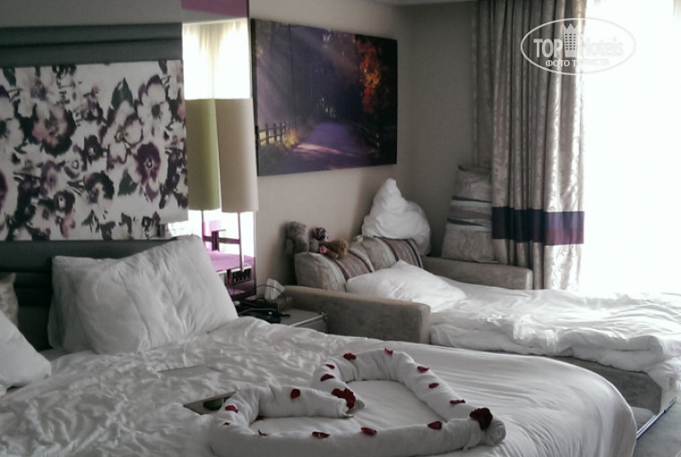 Номер: у нас был номер Delux с видом на море, хороший, современный дизайн (есть конечно нюансы, что-то не доделано, не аккуратно замазано, но это бывает в каждом отеле, поэтому мы на это не обращали внимание) дополнительное место для ребенка в виде раскладного дивана, в шкафу места достаточно, одежду можно разместить и в самом номере, на стуле и кушетке под телевизором. Места хватает всем )) Очень красивый вид из номера на бассейн и море.