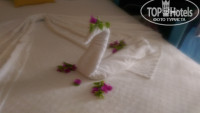 А теперь все по порядку. Летели мы большой компанией: я, муж, двое деток 4,5 и 1,3 года и бабушка с дедушкой. Приехали в отель мы около 11 часов дня, в течении 20 минут нас заселили в номера еще лучшей категории чем мы бронировали, за это Спасибо ребятам Reception. Нам посчастливилось и номера мы получили в главном здании, на 1 этаже, с террасой вместо балкона (1142 и 1104) - что сначало нам не очень пришлось по душе, но уже к вечеру мы оценили плюсы ))) на террасе столик с 2 стульями и 2 лежака, как говориться, уложили детей спать и не выходя из номера можно наслаждаться солнцем и музыкой у бассейна (при закрытом окне музыка почти не слышна, детям не мешала). В номере было все необходимое, кроватка для дочери, горшок, чайник, мини бар пополняли, если забывали пару раз, то можно было попросить у женщин, которые убирали и ни слова не понимали по-русски, но здорово понимали "на пальца" )))) Убирали, конечно, не очень хорошо, но это не напрягало.