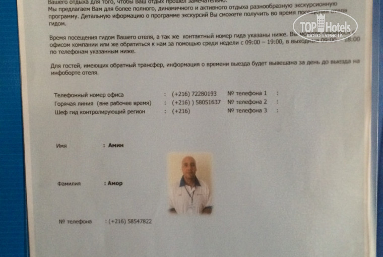 Всем доброго время суток! Я не любитель оставлять отзывы об отелях, так как сколько людей столько и мнений, но все же решил поделиться своими впечатлениями об отдыхе. Взяли мы путевку на отдых в период с 25.09.16 -03.10.16 от КОРАЛ ТРЕВЕЛ Москва. Прилетели мы около 4 часов и где то в 5 были уже в отеле. Скажу честно отель был полупустой и номеров было свободных куча причем с видом на бассейн и на море, так нет нас привели в номер с видом на другой отель со стеной ( кстати это там где был терракт...расстреляли туристов в 2015 году ) , на просьбу заменить номер начали кляньчить деньги, в итоге поторговавшись дали 15 долларов за другой номер с видом на море и бассейн...еще раз повторяю номеров ПУСТЫХ реально очень много! Ну ладно с этим разобрались, далее выяснилось что не работает кондиционер, подали заявку на ресепшен, за 2 дня до отьезда пришел араб и говорит где у вас протекает?....в итоге выяснилось что он пришел чинить толчек...а не кондиционер...ужас....в итоге кондиционер таки не починили. Уборка в номере была каждый день, но поверьте мне на слово уборщица каждый день шарила по вещам и по сумкам, мы даже документы и деньги и все что ценно для нас носили постоянно с собой, так как сейф у них древний с ключем!!! Что касаемо территории она не очень большая, но стараются ее поддерживать в чистоте, а вот здание в лобби наверное давно пора ремонтировать....были дожди и в лобби ставили ведра, так как текла вода...ужас!!! Кормили средненько, и ассортимент постоянно уменьшался! Пляж чистый, а море реально вонючие, воняет канализацией, для меня это просто шок, такого я еще нигде не видел....даже в нашей АНАПЕ, да и вообще не первый раз за границей...есть с чем сравнивать Египет, Турция, Кипр , тайланд. Лежаков на море хватает на всех, НО смотреть за полотенцами которые вы берете надо постоянно, так как их воруют...а потом требуют с вас 10 долларов штрафа...! И хотел бы рассказать именно про нашу ситуацию произошедшую в этом отеле. В номере на туалетном столике лежат обычные стекла для красоты наверное ( фото забыл сделать ) , так вот одно из стекол дало трещину!Мы люди честные пришли на ресепшен и обьясняем что есть проблема такая, на что нам быстро ответили, причем даже не поднявшись в номер и не посмотрев...платите 35 динаров!!! Я конечно платить не собирался....это не мой косяк! Стали искать нашего гида,кстати которого мы увидили ОДИН раз при заселении и ВТОРОЙ раз когда вызвали его разобрать нашу проблему, в отеле его постоянно нет!!! Нашли его по средством мобильной связи, на просьбу приехать и помочь нам, он хамски ответил что ехать не собирается и что решайте этот вопрос сами! Ситуация накалилась, в итоге он приехал, я нашел управляющего отелем, с горем пополам обьяснили что это не наша вина что стекло дало трещину ...НЕ РАСКОЛОЛОСЬ...НЕ РАЗБИЛИ ЕГО...А ДАЛО ТЕЩИНУ, только после этого нам сказали НЕ ПЛАТИТЬ!!! ГИД АМИН АМОР, ( ФОТО ЕГО С ИНФОРМАЦИОННОЙ ДОСКИ ПРИЛАГАЮ ) хам редкостный....ни слова в нашу защиту, а наоборот говорил нам заплатить и встал на сторону арабов. Такого я нигде не видел! Господа в КОРАЛ ТРЕВЕЛ, увольнять таких гидов надо! Надеюсь что мой отзыв кому нибудь поможет не брать путевку в этот отель,не стоит он того поверьте!!!