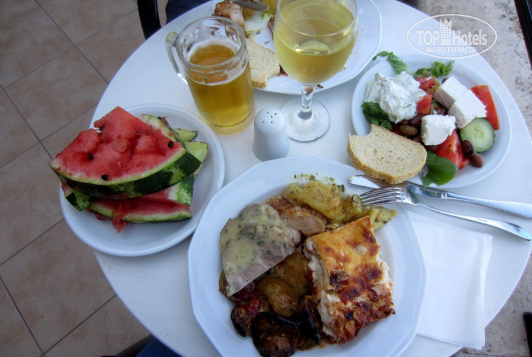 На обед и ужин : мясо трёх видов ( при нас была свинина,крольчатина,говядина,телятина,индюшатина и курятина,всё чередуется),рыба,мидии,тёплый салат из морепродуктов (мидии,осьминог,крабовые палочки(зря,конечно они их добавляли)), мусака,картофель фри,печеный картофель,картофель в соусе,спагетти с разными соусами,рис,зелень,помидоры,огурцы,перец болгарский,оливки, сыр фета,можно было из ингредиентов сделать себе греческий салат ,полить оливковым маслом, также дзадзыки ,греческий соус ,ну очень мне нравится.Из фруктов при нас был арбуз,дыня,апельсины,виноград,из десертов - мороженое,пироженки(не больше одного вида за раз),желе,кремы.Супы не очень вкусные.Из спиртных напитков пиво хорошее и белое вино,муж пробовал раки и коньяк местного производства,вроде ничего. Читали в отзывах,что попадаются грязная посуда,мы увидели не очень чистые тарелки,только,в последние два дня нашего пребывания.Просто выбрали себе чистые.