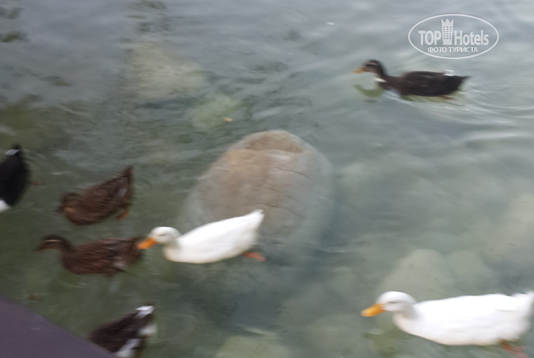 Роскошная территория, большая, зеленая и ухоженная. Интересное решение в виде искусственной речки с утками. Утки прикольные и совсем ручные, с удовольствием лопают предложенный им хлеб, даже на берег за ним выходят.