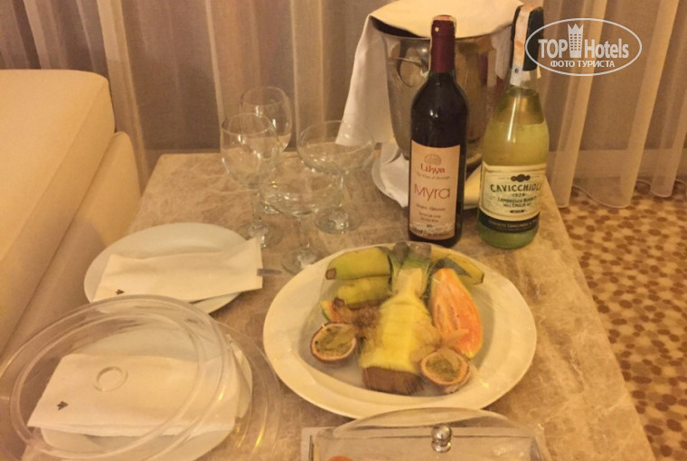 При заезде, как постоянным гостям, нам принесли приветственный комплимент - фрукты, сладости и бутылку шампанского в номер. Очень было приятно.