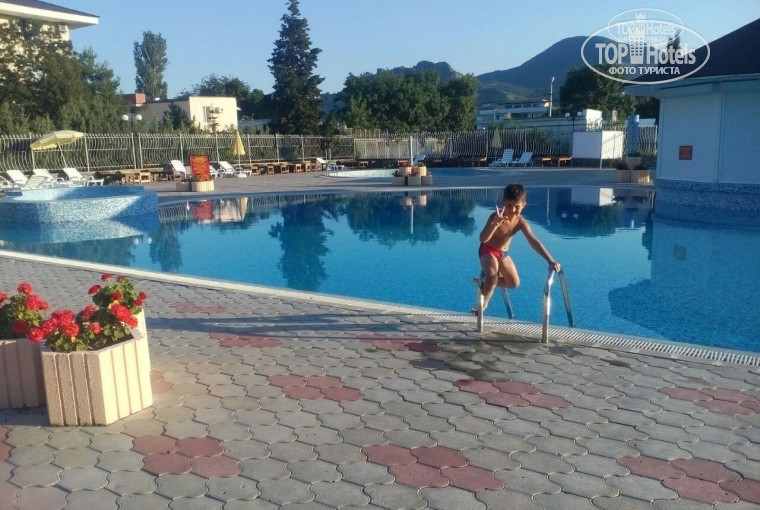 Отдыхали с семьей и 2-мя детьми 11 и 6 лет. Выбирали вариант из бюджетных.10 дней за четверых обошлось где то в 60 тыс. Начитавшись отзывов, слегка переживали, но... При заселении были приятно удивлены! Номер 2-х комнатный2-й корпус 3-й этаж, вполне себе, с кондиционером, мебель нормальная, диван и кровати замечательные! Конечно не пятизвездочный, но мы довольны! Холодильник, телевизор, а вид из окна на море и горы... Ммммм! Особое удовольствие доставило то, что корпус буквально в 30 метрах от набережной и пляжа! Весь день можно ходить туда обратно, если дети устали, не напрягаясь! Это самый главный плюс! По питанию соглашусь с написанным... Столовая СССР. Голодным не уйдешь, но все однообразно, без изысков. Гречка, рис, картофель. Суп овощной, гороховый, куриный. Котлетки маленькие, иногда запеченое мясо. Свежие огурцы каждый день, яблоки дольками и бананы. Но не ограничивают, накладываешь сам себе сколько угодно. Территория средняя, асфальтовая центральная аллея до пляжа, дорожки по территории. Бассейн понравился на территории, напитки там же прохладительные, как и в столовой - компоты. По набережной вечерами гуляли с удовольствием, есть где посидеть и из чего выбрать. правда вечерами иногда громкая музыка кафешек мешала... Так что близость к морю и плюсы и минусы... Пляж галечный, сначала напрягало, потом привыкли. Дети по моему вообще не почувствовали... Цены в магазинах не ниже московских... Пиво крымское - 70 рублей, помидоры свежие 80. Молочные продукты - заоблачные цены. Очень дорогие экскурсии, так никуда и не выбрались, к сожалению... Но! В Коктебеле рядышком потрясающий открытый аквапарк, и дельфинарий! Это что то! Эмоции зашкаливают! Обязательно сходите! Анимация только вечером в 19.00, жуткая, пара вялых студентов вроде были, но что они делали... Скорее всего засыпали на ходу... В первый же день поплыли с пирса на корабле "Грэй" на экскурсию к горе Кара-Даг и золотым воротам.. 500 руб, но оно того стоит. Основной контингент отеля пары с детьми, молодежи в отеле делать нечего, но если тусить на пляже днем, вечером в кафешках и приходить лишь ночевать - то вполне! В целом мы довольны, и я ловлю себя на мысли, что несмотря на столовую (единственный минус) хочется вернуться сюда снова!