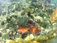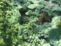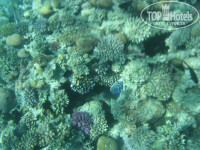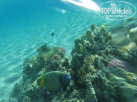 Полноценного кораллового рифа тут нет (поэтому сперва было некоторое разочарование в сравнении с пляжем отеля в районе Makadi, в котором мы отдыхали в прошлый раз), но тем не менее тут есть несколько небольших коралловых «пятачков» с рыбками. В зоне огороженной буйками их два: в правом и левом углах. В отличие от рифа Makadi, где многочисленны рыбы-хирурги и рыбы-попугаи, тут я не увидел представителей этих красивых видов. Тем не менее, на правом «пятачке» в качестве заплывавших гостей я видел голубого псевдобалихта, взрослую особь императорского рыбы-ангела, рыбу иглу, крылатку-зебру, которая ждала сумерек, спрятавшись в расщелине под кораллами. На левом «пятачке» живёт небольшой осьминог.