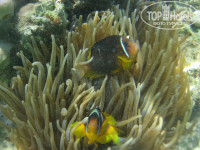 Рекомендую один коралловый островок рядом с пляжем, который нашел, уплывая налево от пляжа в сторону старого причала. Он не очень большой, но с красивыми кораллами и расположен на удачной глубине: не очень глубоко, поэтому всё хорошо видно, но и не сильно мелко, т.е. можно спокойно плавать прямо над ним не боясь зацепится за кораллы и поранится. На этом островке живёт молодая особь императорского рыбы-ангела (цвет и рисунок которой кардинально отличается от взрослой особи). Ориентиром для быстрого поиска этого островка может служить ближний к отелю край комплекса цветных фонтанов – дойдя по берегу до этого места заходите в воду и плывите в море перпендикулярно берегу примерно метров 15-20.