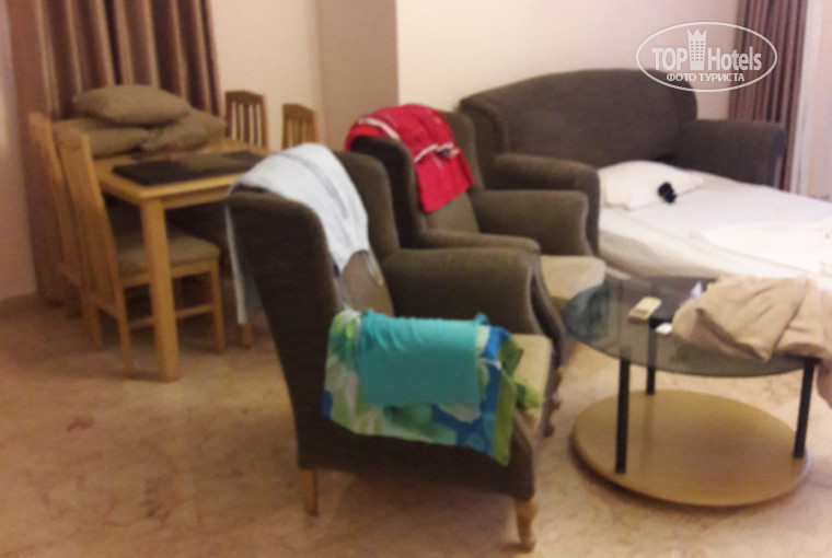Поселили в семейный номер с 2-мя комнатами. Площадь 45м2. Мебель, сантехника нормальные. ТВ не плазма, но особо и не нужен был, только дети смотрели «Машу и медведь» и «Фиксики» на турецком. Был один какой-то русскоязычный канал и украинский «2+2». В номере чайник, фен, кондиционер. На балконе пластиковые стол и стулья, сушилка. Сейф платный – EUR 2\день. Если ценности демонстративно не оставляете на видном месте, ничего с ними не произойдет, т.к. территория отеля закрытая (вы там даже авто не увидете).
