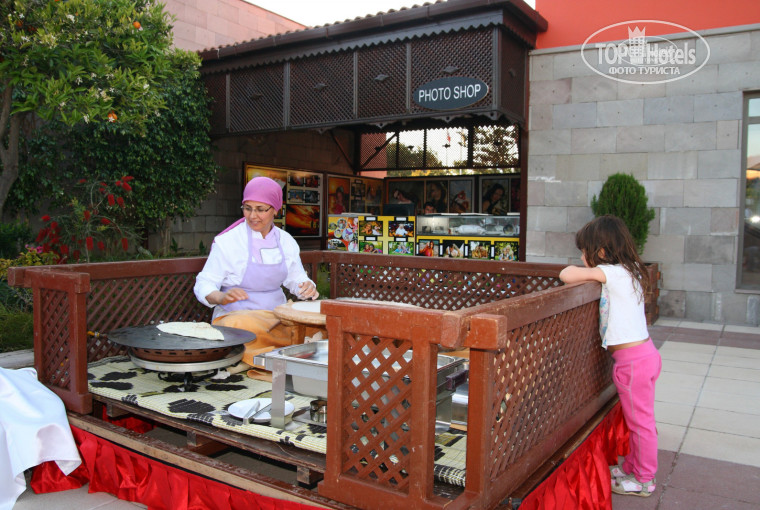 Ресторан хорош! Нужно понимать, что сезон в этом отеле начинается с начала мая, тем не менее фрукты, овощи и зелень были всегда. Не было ни одного дня, чтобы не было клубники – похоже ею там объедались все гости без исключения. Только однажды на фруктовом столе были яблоки одного сорта, апельсины и груши. Я это списываю на некий форс-мажор. Персонал в ресторане понравился – приветлив и ненавязчив, мы оставляли одному дядьке чаевые, вообще не жалко! Он так суетился, столько внимания и нам с женой и детям. Просто молодец. Некоторым отдыхающим из Европы украшали стол лепестками роз и полотенцами, правда, за отдельную плату. Каждый день была рыба, причем разная: жареная, из духовки, на закуску, в салатах. Супруга объедалась от пуза. С мясом тоже проблем не было. Я насчитал: говядину в разных способах приготовления, баранину (была каждый день), курица (вообще рай для любителей птицы, разве что мороженную не подавали), индюшка, даже перепелка была! Готовили реально вкусно, за восемь суток еда не то чтобы надоела, не успели всего попробовать. Думаю, что ценителям вкусно и сытно поесть в Фелисии будет комфортно. Сыров тоже было множество сортов, но они не по-европейски соленые. Я родом с юга – мне сыры понравились. Для деток всегда можно что-нибудь набрать. Был и диетический уголок. Однажды за наш отпуск я заметил борщ!!! Весьма вкусный. Но не стоит ожидать русских супов, их мало где готовят. Кстати, борщ так и назвали «russkyi soup». Забавно было наблюдать за немцами, которые пожимали плечами. Одной пожилой паре я настоятельно порекомендовал. Не проследил – съели ли они его . Чуть не забыл про сладости: по вечерам и на обед их, традиционно для турецких отелей, было много и на всякий вкус. Каждый день были торты! Нам же полюбился молочный шоколад в стеклянных розетках.