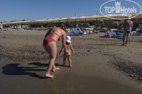 У отеля большой песчано-галечный пляж с большим количеством лежаков. Правда, он грязноват - уборку на нем делают крайне редко, да еще и туристы наши по своему народному обычаю норовят загадить все вокруг себя - но зато песчаный. Это удобно для детей. От набережной через пляж до лежаков проложены три дорожки, сколоченные из растрескавшихся ломающихся досок (которым лет раза в два больше, чем отелю) - причем въехать на дорожку с коляской очень проблематично, довести ее до набережной неизвестный мастер почему-то не захотел. Хотя мы навострились (ну вы поняли).
