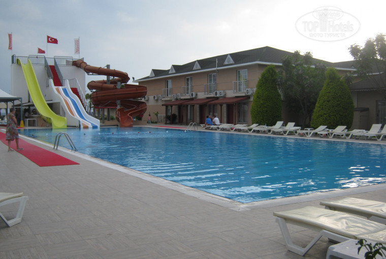 Только что вернулись из этого отеля. Прекрасно отдохнули!!! Находились там с 05 мая по 13 мая 2017г. Отель понравился и цена за путевки тоже, за двоих мы заплатили 46 т. руб за 9 дней, 8 ночей. Хочу отметить самое главное: первая береговая линия, песчаный пляж, пологий вход в море, прекрасная еда (в меню рыба, мясо, сладости, арбузы, грейпфрукты, апельсины, яблоки), с 11.00 до 16.00 ежедневно мороженое 6 видов и турецкие лепешки с сыром, зеленью и фаршем в неограниченном количестве, на территории 2 больших бассейна, водные горки, большое количество баров по всей территории, хамам работал с 9.00 до 20.00. Брали массаж за деньги- просто СУППЕР! Пробный массаж делают бесплатно. Я не первый раз в Турции, но такой хорошей детской площадки я нигде не встречала. Там был большой батут, паровозик, который возил детей, качели. Комната нам досталась на 1 этаже с балконом, телевизор-плазму даже не включали, некогда было смотреть. Аниматоры стараются, весь день проводят конкурсы в бассейне, зарядку, аквааэробику, водное поло - никто не скучал. Самое главное - было теплое море +23+24, мы практически до ужина были на пляже и купались. Очень понравилась вечером пенная вечеринка и концерт живой музыки. От аэропорта близко - ехать 30 мин. Вокруг отеля сосновая роща - воздух замечательный. Советую всем: езжайте и отдыхайте. Не пожалеете! Отель ждет Вас! После 2-х годичного простоя турки очень стараются, чтобы мы к ним опять приехали. Удачи!