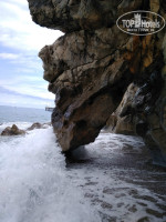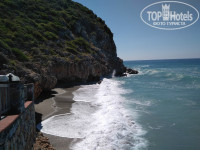 У подножья горы, бесплатный песчано-галечный пляж, с хорошим входом в море, почти без камней (на фото). Море здесь чистое, прозрачное, бирюзовое. Волны красиво разбиваются об скалы.