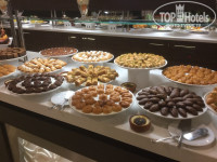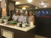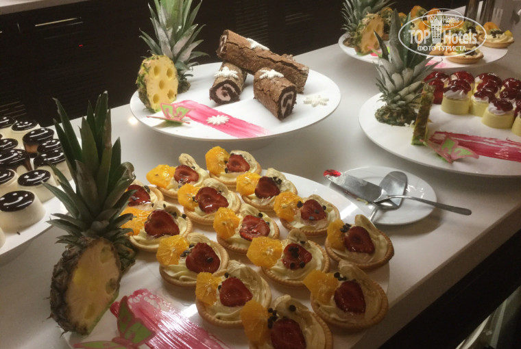 Отдыхала в отеле одна с 17 по 27 мая. Летела Турецкими авиалиниями , вылет из Внуково в 3.50. Всем рекомендцю лететь именно этой авиакомпанией. Прекрасный сервис, еда, очень комфортные сидения с телеком и наушниками. Не сравнить с норд вин и другими нашими чартерами, где все с точностью наоборот. В отеле была в 11.00, номер был уже готов, заселили быстро. Жила на первом этаже с видом на отель Сапфир. Номер набольшой,. Весь номер занимает большая двуспальная и односпальная кровать. Мне одной было комфортно. Думаю,что,если жить втроем, будет тесно. Жутко шумели при отрытом балконе( как в самолете шум), кондиционеры соседнего отеля. А по утрам громыхал мусоровоз. Первое, что печально поразило - в пятизвездочном отеле нат тапочек и халата. Пол кафельный, холодный. Без халата очень неудобно было ходить на массаж. Один сеанс массажа можно сделать бесплатно-30 минут. Мне делала Насиба. Всем очень рекомендую обращаться и делать у нее. Очень профессиональна массажистка, знает свое дело, а главное, делает на совесть, полностью выкладывается. Еще мне не понравилось освещение в комнате- света явно мало. Ходишь в потемках вечером. Только в ванной комнате ярко горят лампы. Ванная странно сделана, надо приноровиться, чтобы вода не текла на пол. Шторки нет, только половинка ванны перекрыта загородкой. Еда, по сравнению с прошлыми годами, конечно, стала хуже. В Турции тоже кризис. Если мяса раньше было в изобилии, особенно вкусно готовят здесь баранину, то за все время моего пребывания в отеле, баранины не было ни разу. Один раз было сердце ягненка(очень вкусно) и говядина пару раз. В основном курица, индюшка, рыба. Курица в разных вариантах- гриль, тушенная, вареная. Много овощей, приготовленных на гриле, еще их тушат в большом чане, на обед( бар возле бассейна). Кто их любит, тому повезло. Я не любитель этого. Но самый огромный выбор и восторг вызывают приготовленные шеф поваром сладости . Торты-это просто произведения исскуства, то в виде невесты, то в виде осьминога, черепахи!!!! Разнообразные пирожные,турецкие сладости!!!! Все это радует глаз и поднимает настроение. Еще очень радовало доброжелательное и быстрое обслуживание официантов. Ребята очень стараються, напитки приносят быстро. Отдельное СПАСИБО за отличное обслуживание и внимание Mustafa Saнin и Ahmet Akyaka. Ну, а если вы еще дадите немного чаевых, то все вообще будет на высшем уровне. Вечером можно посидеть в баре на улице или пойти на шоу. Остальное очень детально описано ниже другим отдыхаюшим. Да, огромный плюс отеля, что расположен в бухте и рядом находится очень недорогой рынок. Я с удовольствием вернусь в этот отель.