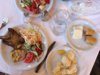 На ужин: свежие овощи, естественно греческий салат, порой салат из капусты, порой салат из холодных макарон (не знаю увы как он называется, но в отелях часто его встречаю), жареная картошечка (очень вкусная), картофель фри, порой мясо, порой курица, рыба, лазанья, рис, макароны, брокколи, цветная капуста, пицца, сэндвичи, вкусные десерты, дыня/арбуз. Напитки по нашей системе питания за доп.плату. Вино, чай, соки – 2,5 евро, пиво – 3 евро. Вода бесплатно, кувшины стоят в холодильнике на входе в столовую.