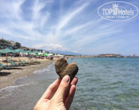 Как уже сказала, до моря нужно немного пройтись. Побережье представляет собой длинную песчаную полосу, порой встречаются зоны с мелкими камушками. Вход в море пологий и довольно продолжительный, волн в спокойную погоду нет, если ветрено, то небольшое волнение может быть. Лежаки и шезлонги платно. Но есть места, где можно просто и на полотенчико прилечь, что мы собственно и делали. В мае в море конечно можно зайти, мы купались, но сказать, что оно теплое и комфортное всё-таки нельзя.