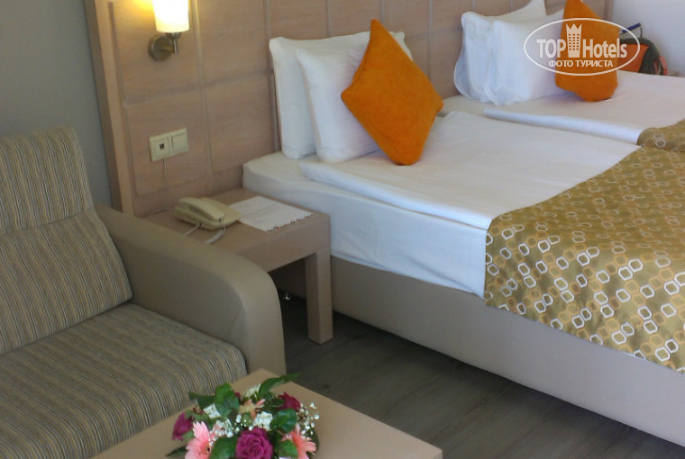 Номер мне дали с шикарным видом на территорию отеля, бассейн и море - я даже не ожидала! Номер довольно просторный, я бывала в турецких отелях с крошечными номерами, поэтому знаю, что говорю. В номере есть всё необходимое, в т.ч. халаты с тапочками и сейф. В ванной, помимо стандартного набора шампуней-кондиционеров-гелей так же были и з.щётка с пастой и бритвенный станок с кремом для бритья. Что касается минибара: каждый день пополняется только водой с газом и без газа. А пополнить и разнообразить ассортимент напитков можно в минимаркете на нижнем этаже с помощью карты, на которую со дня вашего приезда начисляются баллы, на которые вы можете купить газ. напитки и пиво, на своё усмотрение. Честно говоря, никто из гостей не увидел надобности в этой карте, потому что любые напитки можно получить на розлив в многочисленных барах или взять баночные варианты из холодильников на территории. Но, оригинальный подход - это интересно)