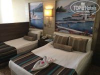 2. Заселение и номер. Приехали в отель в 09.45, нас встретила улыбчивая администратор (говорит по-русски) и отправила на завтрак, после чего сразу заселили (сей аттракцион невиданной щедрости из-за неполного отеля, но все равно приятно!). Если едите в отель в высокий сезон, то лучше бронировать номер на день раньше прилета и на день позже вылета, иначе заселят не раньше 14.00 и выселят в 12.00. Стопудово, отель полный. Скандалы, наличие детей (как и у большинства гостей) и слезы не помогут и единственное, что можно будет сделать - по приезду написать гневный отзыв на тему "не заселили, хотя и не должны были, но все равно неприятно, плохой отель". Либо выбирать удобные вылеты, чтобы времени слоняться без номера не было (хотя опять же с чартерами это ненадежно).