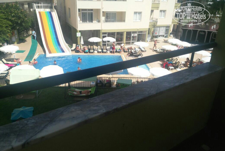 Заселили сразу по приезду, номер маленький, но уютный. В номере кондиционер, фен, холодильник - все рабочее. Окна выходили на задний бассейн с горкой. Отель был полностью заполнен, так как у турков были каникулы в связи с Курбан-байрамом.