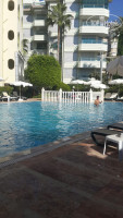 В отеле 3 бассейна, в круглом прохладная вода. В основном бассейне регулярно проводились водные игры. Пляж очень близко, 1 минута ходьбы через переход-арку. Заход в море пологий, дно - песок, иногда мелкая галька. Шезлонгов достаточно.
