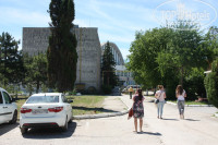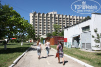 Отель с хорошим расположениям,Когда то давным давно это наверное был очень хороший санаторий, но на сегодня. что то от него еще осталось. Нам рассказали что есть определенное лечение, которое есть только у них, но какое не сказали ))) Я сам в отеле не жил но рассматривал его для отдыха в Евпатории. Если бы я бронировал номер для себя.. то остановился бы на номерах в лечебном корпусе, там тише и номера уже отремонтированы, а номера в основном корпусе оставляют желать лучшего, даже комфорт)) отличаются только кондиционером и видом на променад(практически без ремонта ) С едой в санатории тоже возникали проблемы, но на сегодня вроде бы это уже решено. Дельфинарий в отеле не работает. Отель находится вблизи всякого рода развлечений и даже сдает площади в аренду детским городкам и т.д. так что за анимацию в отеле это тоже считать нельзя )) Дааа еще в основном корпусе стоит не понятный запах, я надеюсь это только в начале сезона, а цена номеров в лечебном корпусе совсем не демакоратичная