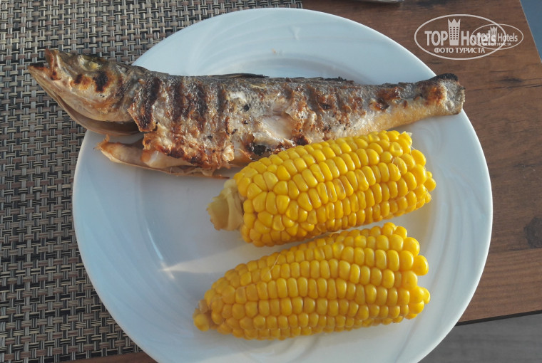 Конечно, главный козырь отеля - это кухня. Большое разнообразие блюд, всегда все разное и очень вкусное, мясо, рыба, гарниры, салаты, сыры, закуски, сладкое, мороженное, фрукты, всего хватает! Особенно отмечу гриль на ужин, за эти блюда отдельное спасибо поварам ресторана! Через день давали морепродукты, из фруктов: яблоки, апельсины, бананы на детском столе, сливы, арбуз, несколько видов неидентифицированных нами местных фруктов) Несколько раз давали нектарины (недозревшие на мой вкус) и клубнику (не успели схватить).