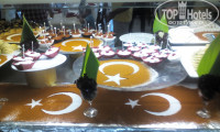 Еды на любой вкус, единственное за 14 дней один раз была другая каша, а остальные дни рисовая молочная утром, к сожалению не ест у меня ее ребенок, и завтраки типа хлопья залитые молоком ( их большое разнообразие), поэтому завтракали круассаном с молоком, пожалела, что не взяла с собой заварную кашу. Мясо каждый день, в наш период отдыха была курица, индейка, баранина, говядина, печень, арбузы безвкусные, но освежают один два раза можно откусить, но смотрю люди едят, абрикосы твердые, клубнику покупали тоже ничего хорошего, апельсины вот что вкусно, сочные.Для себя каждый найдет чем полакомится. Вообще люди едят ведрами, мне кажется каждый пытается наесться на всю жизнь, я первый раз так сказать попала на инклюзив, шок небольшой от людей....