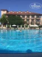Отдыхали в этом отеле с мужем и с сыном(1,5 года). Заселение прошло быстро,приехали в 8 утра, в 10 уже были в номере. Номер обычный, есть чайник, минибар,что очень удобно, так как на завтрак ребёнка не водили я заваривала кашу в номере и хранила творожки (привезла с собой)в холодильнике. Убирались отлично ,каждый день. Территория:очень большая, ухоженная, детская площадка, зоопарк, лошадки,пеликан...ребенку всегда было чем заняться. Еда:так как мы ещё не жуём, я мяла еду вилкой, выбор конечно не большой, каждый день ел одно и тоже:картошка,мясо,брокколи,морковь. Хочу сказать что детского стола как такового нет и диетическое меню тоже очень скудное, очень не хватало каш и нормальной молочки, если у вас ребёнок привередлив в еде, то вам не сюда. Для взрослых выбор конечно побольше, была и рыба и жаренное мясо. В целом за еду 4 из 5 за то что на завтрак есть ну совсем нечего, одни яйца... Что касается ресторана, то это беда конечно, свободных столов в "час пик" не найти. Кстати я свободно выносила еду из ресторана для ребёнка,никто ничего не говорил. Персонал:все вежливые, русскоговорящия девушка на ресепшн всегда помогала решать проблемы, а они к сожалению были. Мы оставили полотенца у бассейна и сходили на завтрак 20 мин, по возвращению их не было, украли!!! И не только у нас,немцы тоже остались без полотенец,штраф 20 евро. Официанты не говорят на русском и улыбаются по большей части только немцам при виде чаевых, не все, но многие, это раздражает .Пляж: мы ходили на море 2 раза в день на часа два, утром приходили в 10 часов и ни одного свободного лежака никогда не было, даже на солнце, но так как мы с ребёнком лежак нам был не нужен, поэтому нас это не смущало. Вход в море пологий, для детишек самое то, не скажу что было очень чисто, носки, стаканчики валялись по два дня. Мне нравилось то что пространства между лежаками и морем очень много и никто никому не мешал. Так же хочу отметить культурную программу, каждый день что то новое, скучать не приходилось. Окрестности: если пойти на лево от отеля, то там довольно большой рыночек со всякими товарами для туристов, направо тоже рынок,но гораздо дальше, метров 800 наверно, там дешевле немного. По экскурсиям не ездили, ничего сказать не могу. Ещё хотелось бы рассказать про такую напасть как комары в номере, в первую ночь ребенка искусали полностью, это просто жесть!!! Причём спали с закрытым окном, они как оказалось летят с вентиляции и из коридора, со второго дня на всю ночь включали средство от комаров в розетку, помогало. Подведу итоги . Плюсы: большая территория,наличие зоопарка, чистота. Минусы: скудное меню для детей, комары,воровство полотенец. В целом отель понравился, но он скорее 4 звезды, приедем ли ещё раз не знаю, зависит от цены, мы за троих отдали 88 тыс, за большие деньги лучше поискать другой отель.