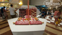 Питание хорошее, всего достаточно - фрукты, овощи ( запеченые, отварные на пару, сырые). Мясо, рыба - очень вкусно приготовлено на гриле, запеченое. Маловато зелени, на мой взгляд...в основном мята, петрушка и укроп...выпечки, пирожных, пахлавы много. Очень вкусная паста с двумя видами соусов, можно было взять и без ничего, только что сваренную. Много конечно острой пищи, но это особенность Турции, и не проблема найти что - то более привычное для нас. Супов 2 вида - суп-пюре и очень вкусный куринный с турецкой коричневой лапшой или вермишелью...на мой взгляд, немного жирноват, но все равно - вкусненький. Отменный гриль на улице, у основного ресторана - рыбка - просто песня!!!! Вкуснюююючая!!! Ели каждый день и детки и взрослые. В общем, может показаться за 10 дней, что еда в ресторане однообразная, на самом деле - все вкусно и на любой вкус. Офиццианты любезные и расторопные, были, конечно, случаи, когда приходилось по паре раз просить о чем либо, но нас это не напрягало - гостей к середине июня стало очень много и, понятно, работы у персонала прибавилось. Мне показалось, что самыми внимательными и улыбчивыми были офиццианты русские и турки. Казахи не очень спешили)