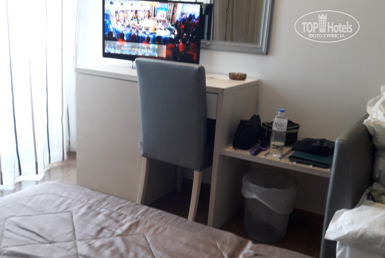 При бронировании отеля выбрали вид на горы (чтобы не всё время только на море смотреть), о чём позже пожалели, потому что вид был на внутренний дворик и подножие горы (319 номер). Нашим главным условием было наличие 3 кроватей, т.к. мы 3 взрослых человека и никакие расладушки нас не устраивали. Каково же было наше удивление, когда в номере обнаружили ... именно раскладушку. Попросили поменять номер, но свободных не оказалось. Были согласны даже доплатить за номер с видом на море. Отмучившись 2 ночи с раскладушкой, хозяйка отеля Лайне предложила на 1 день поселиться в отеле Мистрал Бей в Агиос-Николаусе. Через день сами хозяева нас привезли назад, компенсировав нам неудобства номером в Голден Винге. Вот это был настоящий рай!!! Уже ничто не омрачало наш отдых! В номерах есть холодильник, телевизор (примерно 5 российских программ).
