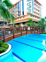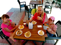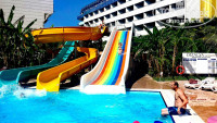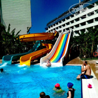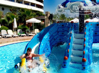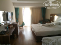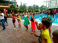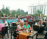 Всем здравствуйте,долго собиралась написать отзыв и вот нашла время.Сразу к делу и кратко. Перелет отличный с Коралом ,трансфер до отеля очень долгий,4 часа,пока всех развезли,отель в самом конце,приехали в 7 вечера,заселение сразу,номер на пятом этаже на крыше,потолок в потеках,духота,сразу сказала,что две недели не выдержим с ребёнком в душегубке,только на следующий день переселили на 3 этаж с видом на бассик,а так вид был на соседний корпус и коттеджики с базаром. Еда никакая,мяса нормального нет,фрукты по минимуму,элементарные,десерты красивые ,но невкусные,напитки это позорное вино,пиво эфес,бавленные местные,нормальный алкоголь за плату,ходили трезвые короче. Отдельный респект женщине на пляже,которая делает гезлимэ,вкусненько,выручало. Анимации толком никакой,привозные шоу танцоры надоели за две недели, на дискотеку в клуб в Аланью возят аниматоры за 10 баксов через день. В 11 вечера отель мёртвый,тишина,все в нумерах,жизнь затихает до утра,капец. Полно семей с детьми,калясками,прям грудных, детсад прям, халява ведь. Молодёж вам тут делать нечего,точно говорю. Лежаков у бассика не хватало,как и столов в ресторане надо было занимать заранее,аж смешно.Море хорошая водичка,заход только с пирса нормальный,пойдёт ,но с мелкими детками никак.В наш заезд отель был переполнен,особенно украинцами,когда уезжали стало по свободнее,а то очереди выстраивались в столовой за едой,толкучка ужас. Развлекали себя экскурсиями, их покупали в двух точках на базаре,цены смешные за море удовольствия,если кому надо подскажу где и как торговаться,но за двоих взрослых и двух детей в море 5 часов на яхте с пенной вечеринкой и обедом 30 баксов отдали например. Деньги снимать можно в Денис банкомате рядом с отелем без процентов в лирах,долларах и евро по текущему курсу.Короче говоря не тянет отель на 5 ,с натяжкой 4 ,а так просто хорошая тройка,не весёлый отель. Даже турецкие ночи по средам никакие и еда не вкусная,да и в а ля карт не стоит идти,еда хуже,чем в основном ресторане,обслуживание отстой .Если бы не наши новые знакомые из Питера был бы крах. Обслуживающий персонал не дружелюбный,уставший,на базаре и то турки веселее и приветливее, чем здесь. В отель не вернёмся в этот, а вот рядышком на первой линии отель отличный,туда и поедем,там настоящая достойная 5. Но если учесть ,что я по раннему бронированию отдала за двоих ,я и ребёнок 10 лет всего 50000,то пойдёт,а вот соседи за такой же комплект перед вылетом 85 отдали,неоправданно.