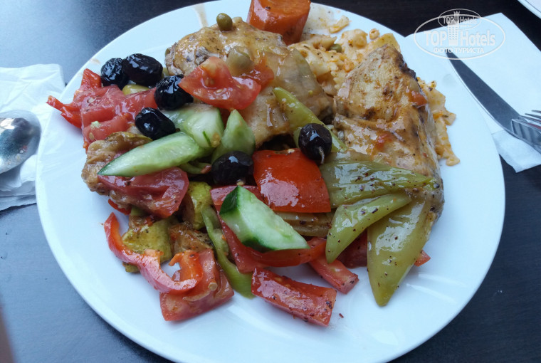 Большого разнообразная в еде нет, но голодным никто не ходил, все всегда было вкусное и свежее. В основном давали курицу, иногда рыбу, овощи. Различные овощные салаты и сыры. На обед и ужин всегда давали дыню и арбуз.