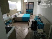 И вот наконец-то наш номер. Перед нами открыли двери и мы вошли. Нам достался номер 103. Все в номере было отличным. Мебель простая, но новая. Маленькая кухня, в которой есть вся необходимая посуда и холодильник, стол и два стула, туалетный столик с зеркалом у стены, плоский телевизор, шкаф при входе, небольшой диванчик. В ванной нас ждала еще одна радость. Вместо подтекающего поддона, который мы ожидали увидеть, душевая кабина. Единственный маленький недочет – это то, что вместо одной двуспальной кровати были две сдвинутые, что в таких отельчиках практически повсеместно. Нас об этом предупредили и в турагентстве, и на этом сайте в отзывах, так что мы были готовы. Кондиционер был не над кроватью, так что спать с ним можно. Он был бесплатный. В шкафу есть сейф, он стоит 2 евро в сутки, но видимо потому, что нас заселили не в тот отель, нам сказали, что мы можем пользоваться сейфом, который есть на ресепшене Lefkoniko Beach бесплатно. Мы воспользовались этим предложением, хотя возможно это и не всегда удобно. Wi-Fi бесплатный, ловит по всему отелю. Особой скоростью не отличается, но для связи с родными, для соц. сетей и инстаграма нам хватало. В номере есть халаты, тапочки, шампуни, кондиционеры для волос, гели для душа, лосьон для тела, мыло для лица, жидкое мыло для рук, туалетная бумага, зубные щетки, бритва, даже губочка для обуви. Все кроме бритвы и губки в двух экземплярах.
